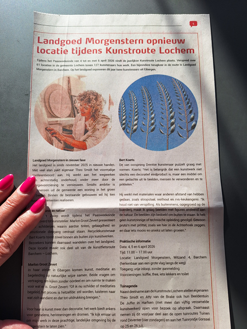Wie tijdens het Paasweekeinde van 4 tot en met 6 april 2026 de Kunstroute Lochem bezoekt, kan kunst en landschap moeiteloos combineren. De route slingert langs 61 locaties in stad en buitengebied, waar 127 kunstenaars exposeren. Een van de meest rustgevende stopplekken ligt net buiten Barchem: landgoed Morgenstern, onderdeel van de speciaal samengestelde kunstfietsroute Barchem – Lochem.